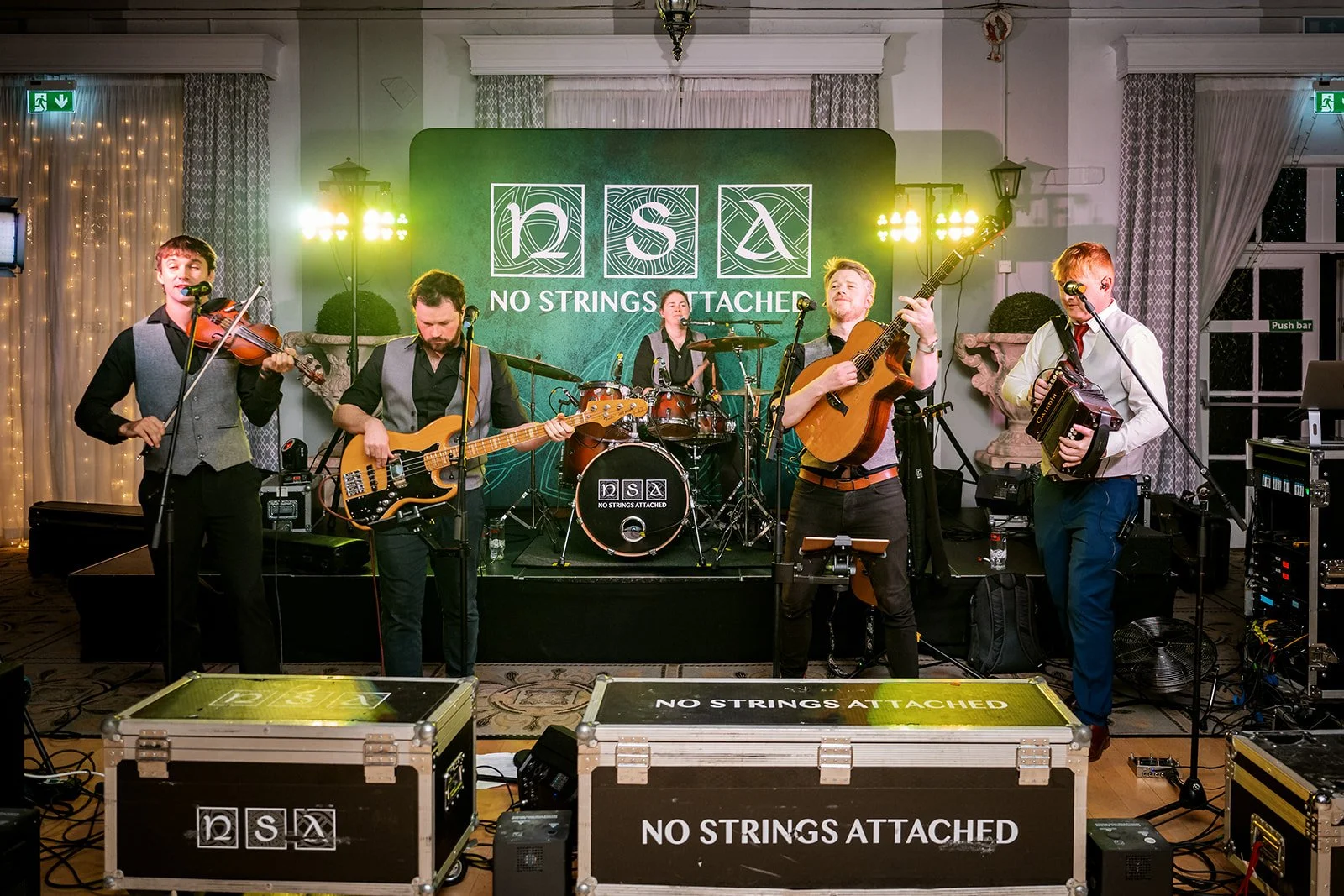 Traditional Irish music sits at the core of who we are—it’s where our sound begins. But what makes No Strings Attached truly unique is how we blend our trad roots with multiple genres, from modern chart hits to country, folk, and rock. This fusion creates a lively, contemporary feel that brings Irish music to a wider audience while keeping your wedding vibrant, inclusive, and full of energy.